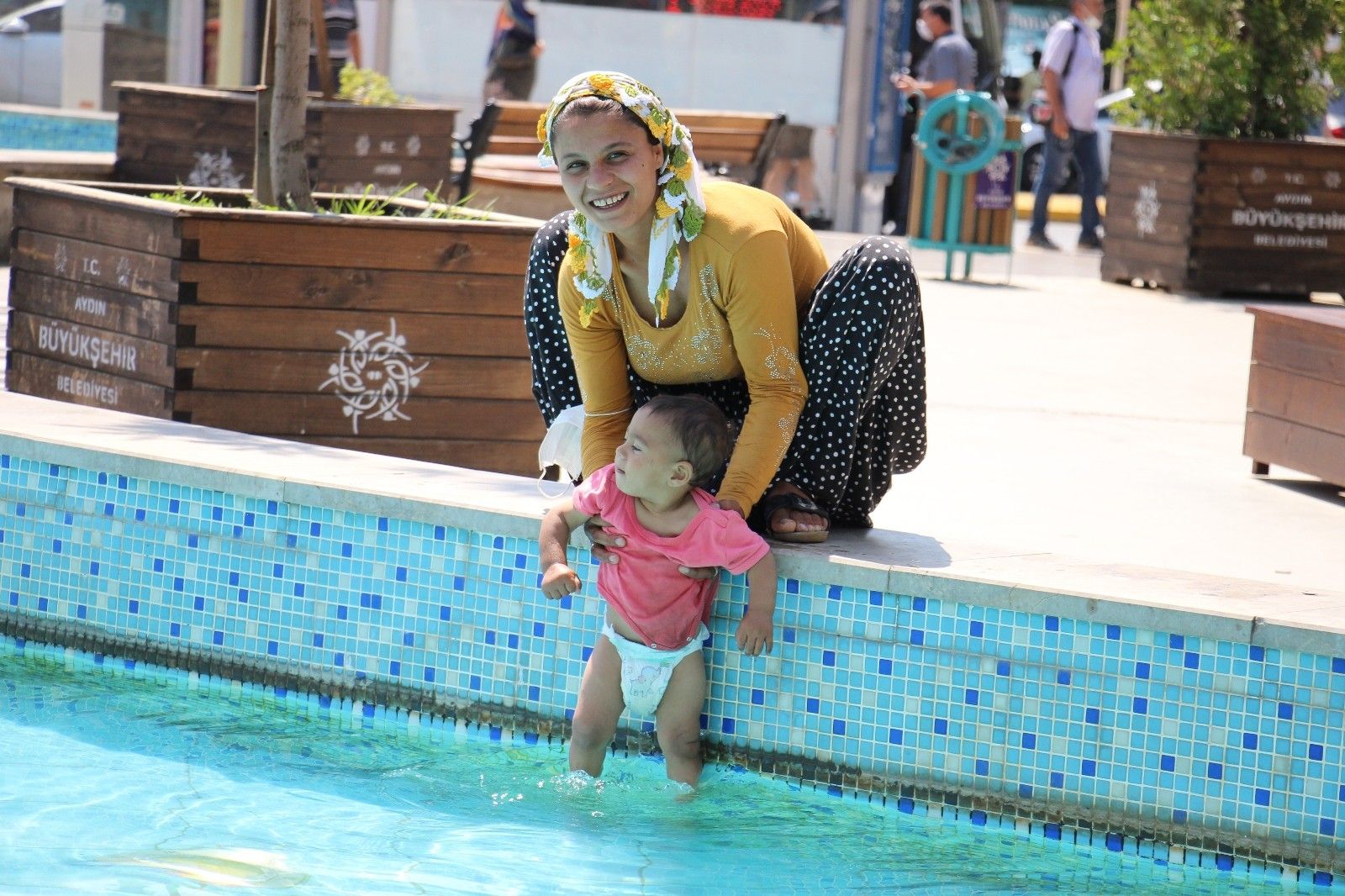 Aydın'ın Efeler ilçesinde son günlerde artan hava sıcaklıkları etkisini sürdürüyor. Termometreler 42 dereceyi gösterirken, bir anne de sıcaktan bunalan bebeğini kent meydanında bulunan süs havuzunda tehlikeye aldırış etmeden serinletmeye çalıştı.