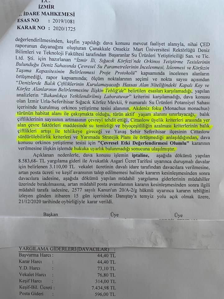 "İlk defa bu sefer, somut olarak, fokların yaşam alanlarıyla ilgili bir belgeye, rapora ulaştık" diye açıklayan Avukat Mercan, "Bu rapor, 1989 ile 2019 yılları arasını kapsayan bir çalışma. Alaçatı'dan başlayıp, Sığacık Koyu'nu da içine alan, fokların yaşam alanları ile ilgili bir rapor. İkinci olarak Seferihisar'ın Cittaslow (Sakin Şehir) olması da önemli bir unsur. Mahkeme, 'Akdeniz Foku türünün habitat alanı ile çakışmakta olduğu, türün aktif yaşam alanını sınırlayacağı, Cittaslow üyelik kriterleri arasında yer alan çevre faktörleri maddesinde su temizliği ve biyoçeşitliliğin azalması kriterlerinin balık çiftlikleri ile tehlikeye gireceği ve Yavaş Şehir Seferihisar ilçesinin Cittaslow sürdürülebilirlik kriterleri ve Yarımada Stratejik Planı ile örtüşmediği' gerekçeleriyle 'ÇED Etki Değerlendirmesi Olumlu' kararının hukuka uyarlık olmadığı sonucuna ulaştı" diye belirtti.