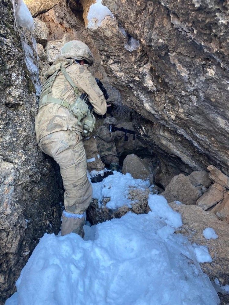 Siirt'in merkez Eğlence köyü kırsalında düzenlenen 'Yıldırım-11 Şehit Jandarma Astsubay Çavuş Celal Özcan 2021/02 Operasyonu'nda teröristler tarafından kayalıklar arasına gizlenmiş silah, mühimmat ve yaşam malzemesi ele geçirildi