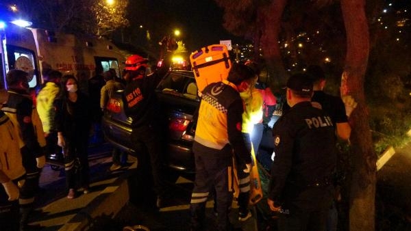 İZMİR'in Konak ilçesinde, sürücüsünün kontrolünden çıkan otomobil refüjü aşarak yol kenarındaki ağaca çarptı. Kazada otomobilde sıkışan karı- koca yaralanırken, kazaya başka bir otomobilin neden olduğu öğrenildi.