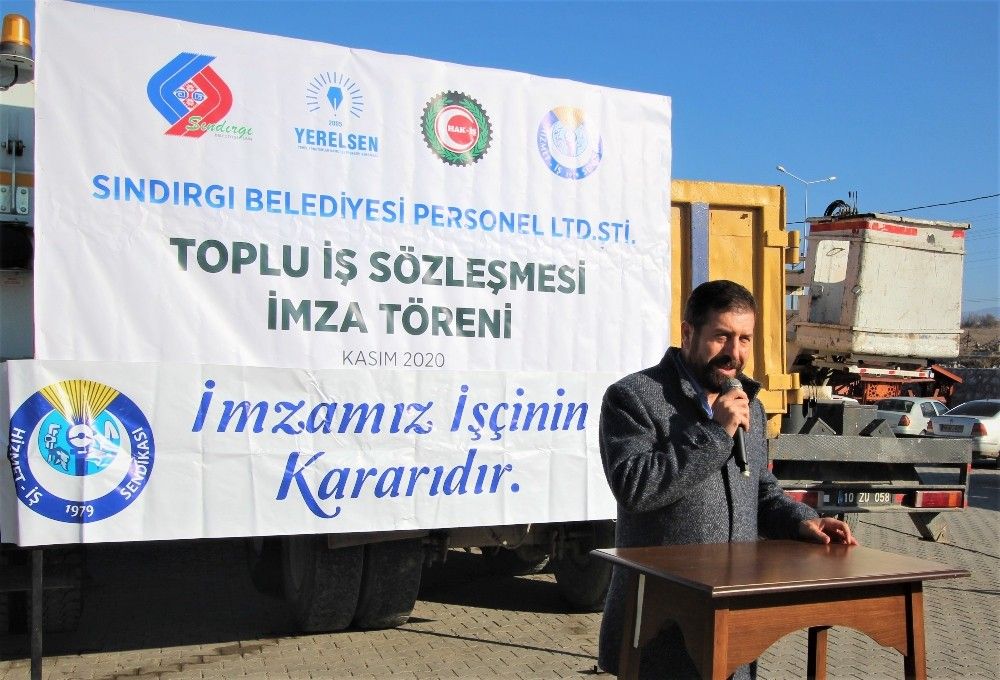 İmza töreni öncesinde konuşan Hak İş Konfederasyonu ve Hizmet İş Sendikası Balıkesir İl Başkanı Savaş Dal, "696 sayılı kanun hükmünde kararnameden sonra, Balıkesir ilimizde ilk kez Sındırgı Belediyesiyle yapmış olduğumuz toplu iş sözleşmesinde emeği geçen, işçinin hakkını savunan ve geri durmayan Ekrem başkanıma çalışan kardeşlerim ve şahsım adına teşekkür ediyorum.