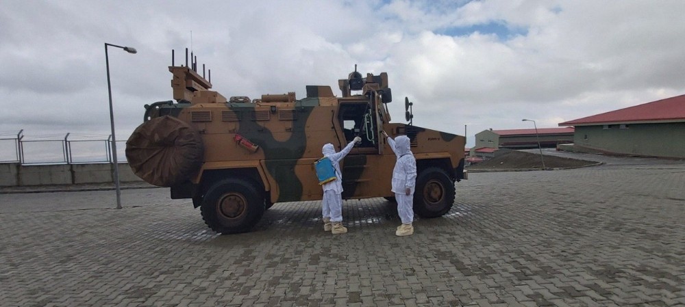 Dünyayı etkisi altına alan korona virüsü tedbirleri kapsamında Suriye sınırında bulunan birliklerde dezenfekte işlemi gerçekleştirildi. Uzman ekipler tarafından yapılan dezenfekte işleminde askeri araçlar, binalar ve kullanımda bulunan bölgeler virüse karşı temizlendi.