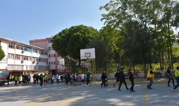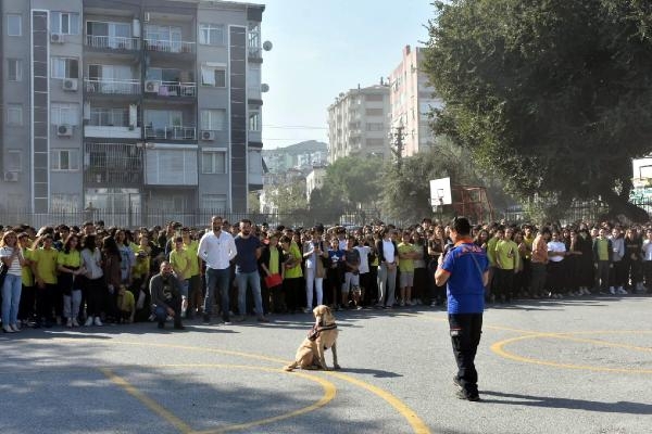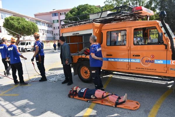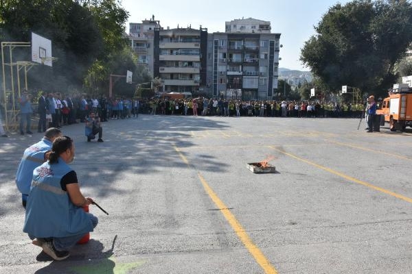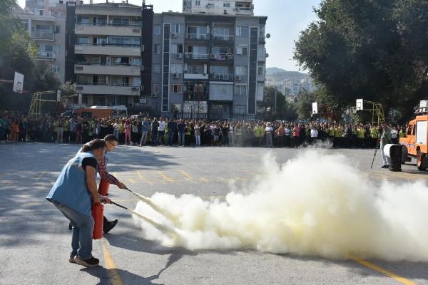 İZMİR'in Konak ilçesindeki Güzelyalı Ortaokulu'nda deprem ve yangın tatbikatı düzenlendi. Tatbikata öğrencilere, deprem sonrası yapılması gerekenler ve alevlere müdahale eğitimi de verildi.