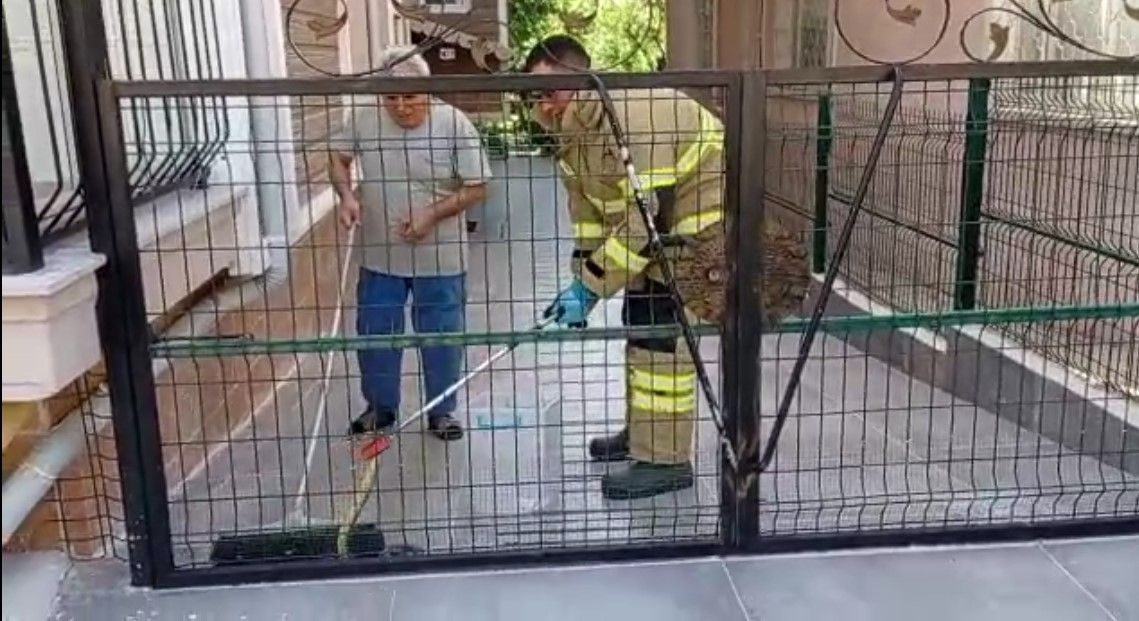 Site giriş kapısına dolanan 1,5 metrelik yılanı itfaiye çıkardı