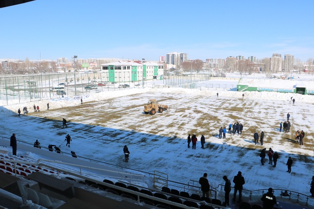 Sivas Belediyespor-Ankara Demirspor maçına ev sahipliği yapacak Muhsin Yazıcıoğlu Stadyumu'nda kar ve buz temizle çalışmaları devam ederken, hakem ve TFF yetkilileri sahayı inceledikten sonra maçın ertelenmesine karar verdi.