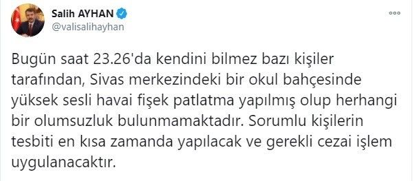 Vali Ayhan paylaşımında, "Bugün saat 23.26'da kendini bilmez bazı kişiler tarafından, Sivas merkezindeki bir okul bahçesinde yüksek sesli havai fişek patlatma yapılmış olup herhangi bir olumsuzluk bulunmamaktadır. Sorumlu kişilerin tespiti en kısa zamanda yapılacak ve gerekli cezai işlem uygulanacaktır " ifadelerine yer verildi.