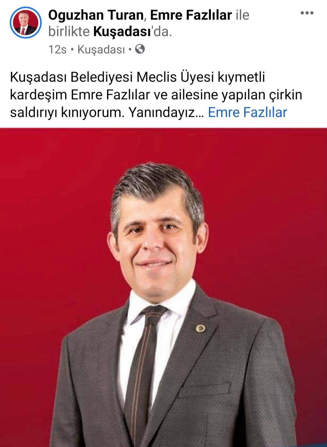 Kuşadası Belediye Başkan Yardımcısı Oğuzhan Turan, "Kuşadası Belediyesi Meclis Üyesi kıymetli kardeşim Emre Fazlılar ve ailesine yapılan çirkin saldırıyı kınıyorum. Yanındayız" şeklinde konuştu.