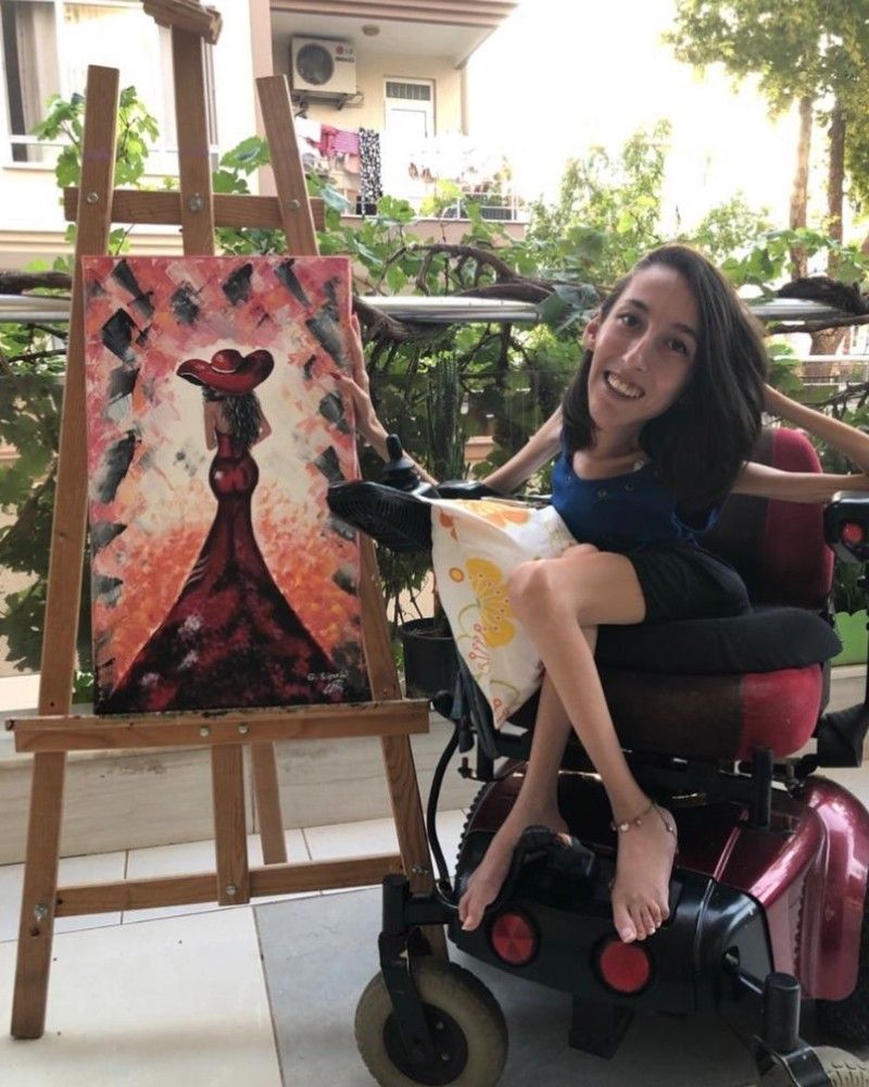 Antalya'da Spinal Müsküler Atrofi (SMA) Tip 2 hastası Gülçin Sipahi'nin (23) evinde çizdiği resimleri görenler hayretlere düşüyor