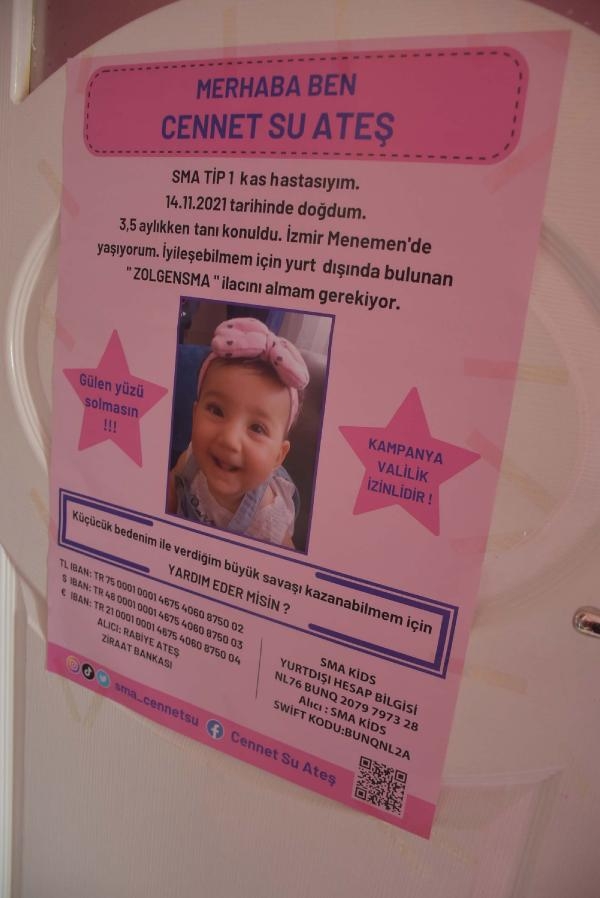 Menemen ilçesinde fabrika işçisi Aykut Ateş (35) ile ev kadını Rabia Ateş'in (31) 4'üncü kızları Cennet Su'ya, 3,5 aylıkken SMA Tip 1 teşhisi konuldu. 7,5 kilo ağırlığındaki 17 aylık Cennet Su, çok sayıda cihaza bağlı olarak sıvı ile besleniyor. Küçük Cennet'in hayata tutunabilmesi için ayrıca İzmir Valiliği onaylı bağış kampanyası başlatıldı. Ancak 6 ay geçmesine rağmen kampanyada istenilen rakama henüz ulaşılamadı.