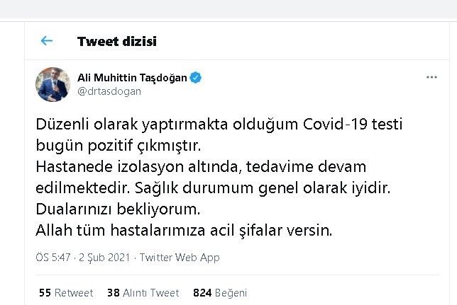 MHP Milletvekili Muhhittin Taşdoğan, sosyal medya hesabından yaptığı açıklamada, korona virüs testinin pozitif çıktığını duyurdu. Özel bir hastanede tedavisi süren Taşdoğan'ın sağlık durumunun iyi olduğu öğrenildi. Taşdoğan, mesajında, "Düzenli olarak yaptırmakta olduğum Covid-19 testi bugün pozitif çıkmıştır. Hastanede izolasyon altında, tedavime devam edilmektedir. Sağlık durumum genel olarak iyidir. Dualarınızı bekliyorum. Allah tüm hastalarımıza acil şifalar versin" ifadelerini kullandı.