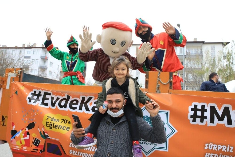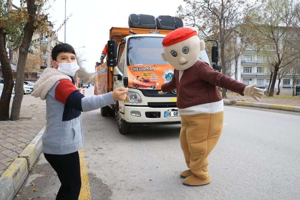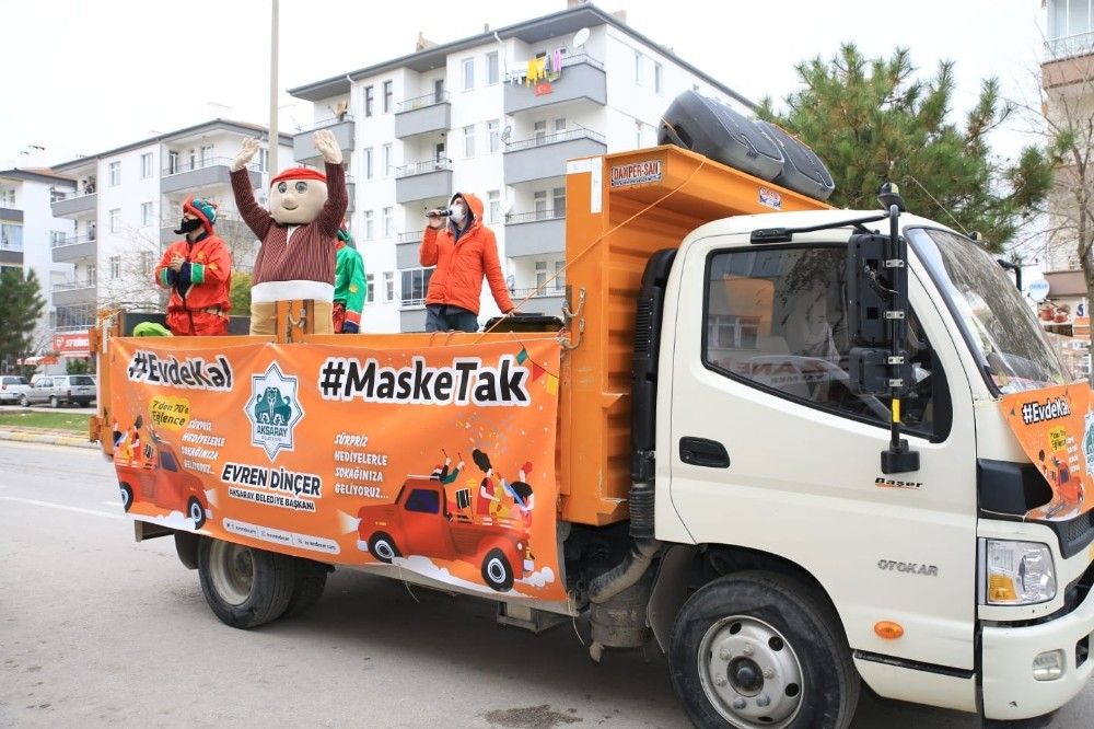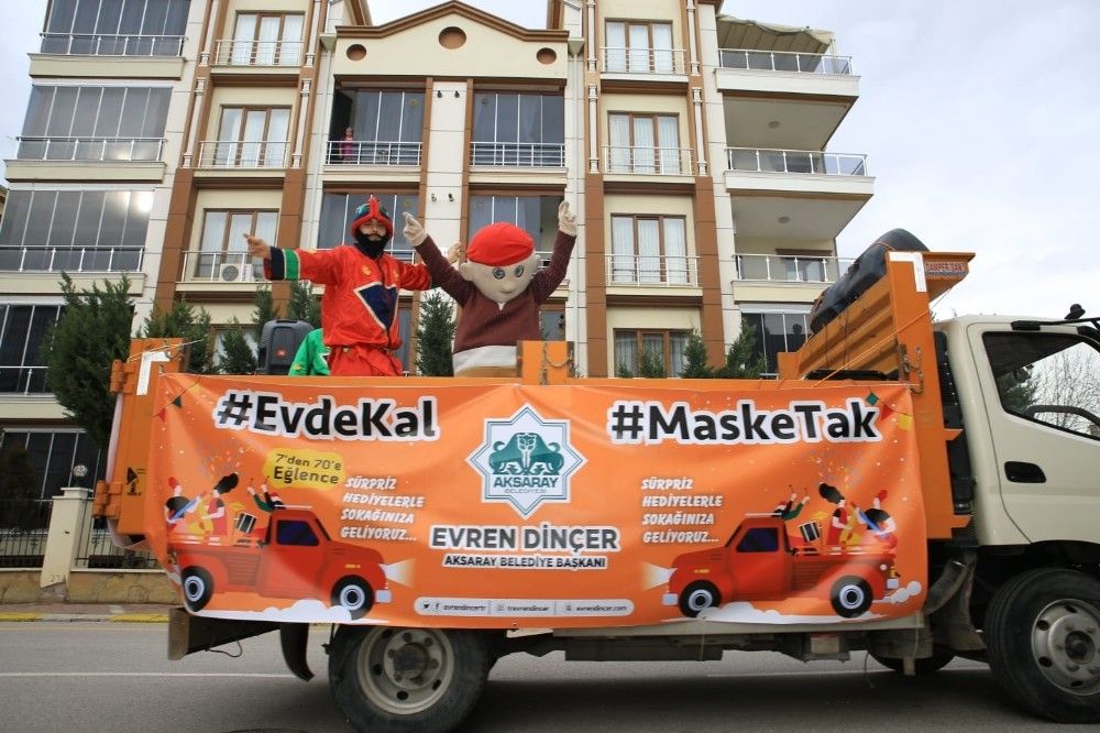 Aksaray Belediyesi kısıtlamada vatandaşların evlerinde sıkılmamaları için bir program düzenledi. Kamyonetin kasasını adeta sahneye çeviren belediye ekipleri, mahalle mahalle gezerek vatandaşlara konser verdi. Camlara çıkarak ve balkonlarından konseri izleyenler evlerinde eğlenme imkanı bulurken, belediye ekipleri gün boyu sokak sokak gezerek konseri sürdürdü. Belediye ekipleri ayrıca çocuklara oyuncak, şeker ve Türk bayrağı verdi. Konser esnasında belediyenin temizlik görevlisi yol ortasında oynayan Keloğlan maskotuyla karşılıklı oynadı. Gündüz ve gece devam eden konserde Keloğlan, Hacivat ve Karagöz elbisesi giyen maskotlar boş sokaklarda müzik eşliğinde göbek atıp oynadılar.