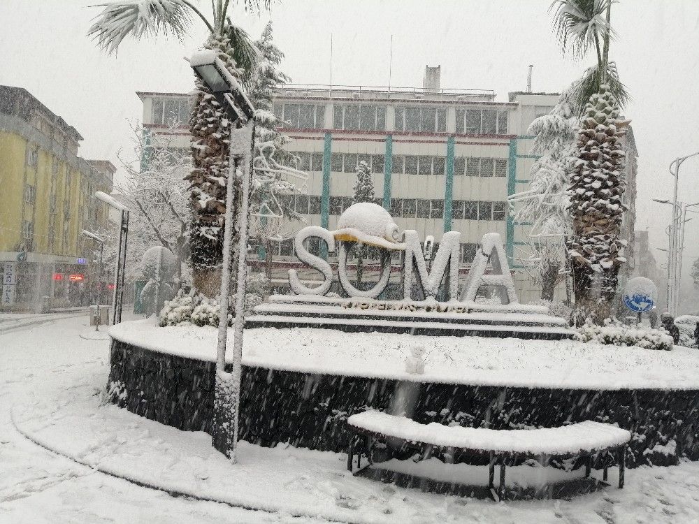 Kurak geçen bir yaz döneminin ardından 2021 yılının ve kış mevsiminin ilk kar yağışı Manisa'nın Soma ilçesinde de etkili oldu. Beyaza bürünen ilçede vatandaşlar kar keyfini yaşarken kar görebilmek için Bursa'ya gittiklerini ancak kar yağışının ardından Soma'nın Bursa Uludağ'ı aratmadığını belirterek sevinçlerini gösterdi. Sokağa çıkma kısıtlaması nedeniyle trafik akışının da olmadığı ilçede yollar da kar tutarken belediye ekipleri yüksek kesimlerdeki köy yollarında bir aksaklık yaşanmaması için tuzlama ve kar küreme çalışmalarına başladı. Bu arada maden ocaklarına giden yollarda da kar nedeniyle çalışmaların başlatıldığı öğrenildi.