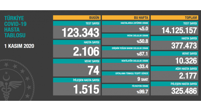 Sağlık Bakanı Fahrettin Koca, Türkiye Covid-19 Hasta Tablosu'nu paylaştı. Tabloya göre, son 24 saatte 123 bin 343 kişiye korona virüs testi yapıldı, 2 bin 106 kişiye hastalık tanısı konuldu. 74 kişi virüs nedeniyle hayatını kaybederken bin 515 hasta iyileşti. Öte yandan şu ana kadar 14 milyon 125 bin 157 test yapıldı. 377 bin 473 hastadan 325 bin 486'sı iyileşti. Ağır hasta sayısı ise 2 bin 177 oldu.