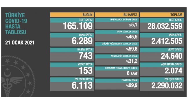 Sağlık Bakanlığının Covid-19 bilgilendirme sayfasında Türkiye'nin güncel korona virüs tablosu kamuoyuyla paylaşıldı. Tabloya göre son 24 saatte 153 kişi korona virüsten hayatını kaybetti, toplam can kaybı 24 bin 640'e yükseldi. Toplamda 28 milyon 32 bin 559 test yapıldı. Bugün yapılan 165 bin 109 testten, 6 bin 289 yeni vaka sayısı, 743 de yeni hasta sayısı olduğu belirtildi. Toplam vaka sayısının 2 milyon 412 bin 505 olduğu, bugün iyileşen 6 bin 113 kişiyle birlikte toplam iyileşen hasta sayısının 2 milyon 290 bin 32'e yükseldiği, toplam hastalarda zatürre oranının yüzde 5,1, ağır hasta sayısının ise 2 bin 74 olduğu açıklandı.