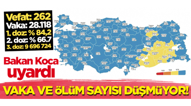 Sağlık Bakanı Fahrettin Koca, sosyal paylaşım sitesi Twitter hesabından yaptığı paylaşımda, "Can kaybımız 262. Vaka sayımız 28.118. Artan hareketlilikle risk daha da yaygın. Yarın tedbirleri uygulayarak, ortalama 1 hafta sonra tablodaki sonuçların değişmesinde, 2. doz aşınızı olarak da, 2 hafta sonra salgına karşı kalıcı başarı elde edilmesinde pay sahibi olabilirsiniz" dedi.