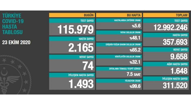 Sağlık Bakanlığının Covid-19 bilgilendirme sayfasında Türkiye'nin güncel korona virüs tablosu kamuoyuyla paylaşıldı. Tabloya göre son 24 saatte 74 kişi korona virüsten hayatını kaybetti, toplam can kaybı 9 bin 658'e yükseldi. Bugün toplam 115 bin 979 test yapılırken, 2 bin 165 yeni vaka tanısı konuldu. Toplam vaka sayısı 357 bin 693 oldu. Bugün iyileşen bin 493 kişiyle birlikte toplam iyileşen toplam hasta sayısı 311 bin 520'e yükseldi. Toplam hastalarda zatürre oranının yüzde 5,6, toplam ağır hasta sayısının ise bin 648 olduğu açıklandı.