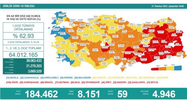 Sağlık Bakanlığı tarafından Türkiye'nin yeni korona virüs tablosu açıklandı. 21 Temmuz'da açıklanan 24 saatlik verilere göre 8 bin 151 vaka tespit edildi. Virüs nedeniyle hayatını kaybedenlerin sayısı 59 oldu. Bir günde toplam 184 bin 462 test yapılırken, iyileşen hasta sayısı 4 bin 946 olarak kaydedildi. Sağlık Bakanlığı tarafından açıklanan tabloda, aşılama verilerine de yer verildi. En az 1 doz aşı olmuş 18 yaş üzeri nüfusu kapsayan verilere göre Türkiye'de 1. doz aşılama ortalama yüzde 62,93 oldu. 2. doz ortalaması yüzde 34,28 olurken, 1., 2. ve 3. doz aşısını olan vatandaş sayısı toplamda 64 milyon 12 bin 165'a yükseldi.