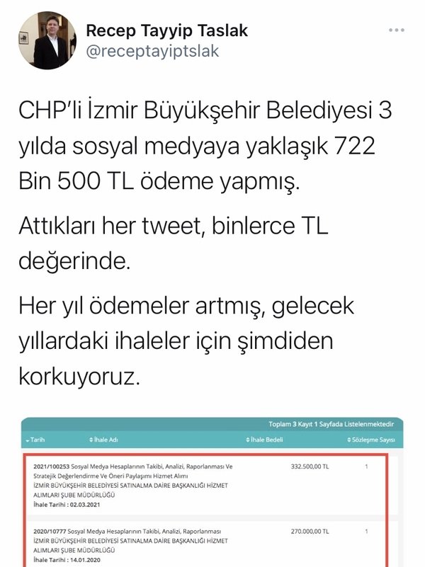 AK Parti İzmir Gençlik Kolları İl Başkanı Recep Tayyip Taslak da; "CHP'li İzmir Büyükşehir Belediyesi 3 yılda sosyal medyaya yaklaşık 722 bin 500 TL ödeme yapmış. Attıkları her tweet, binlerce TL değerinde. Her yıl ödemeler artmış, gelecek yıllardaki ihaleler için şimdiden korkuyoruz" ifadelerini kullandı.