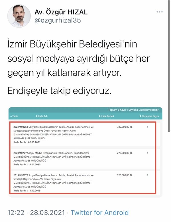 İzmir Büyükşehir Belediyesi AK Parti Grup Başkanvekili Avukat Özgür Hızal, "İzmir Büyükşehir Belediyesi'nin sosyal medyaya ayırdığı bütçe her geçen yıl katlanarak artıyor. Endişeyle takip ediyoruz" dedi.