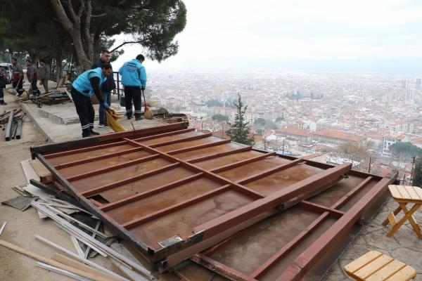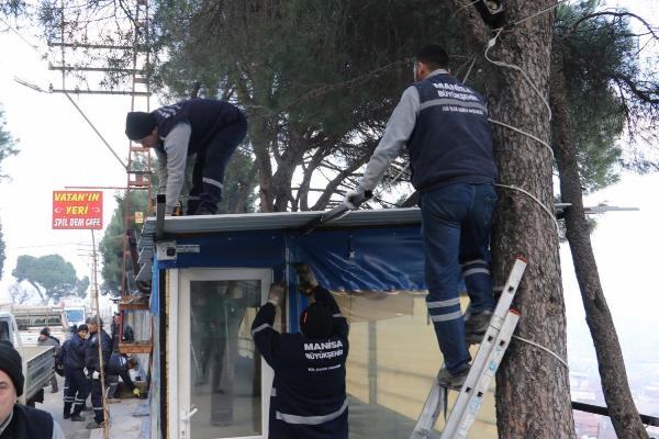 MANİSA'da Spil Dağı Milli Parkı'na giden yolda bulunan kaldırımlarda ruhsatsız kurularak kapalı alanlar oluşturulan ve görüntü kirliliğine neden olan işletmeler, alınan karar doğrultusunda söküldü.