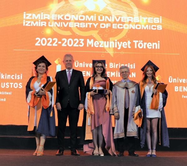 İEÜ Mütercim Tercümanlık Bölümü mezunu Ecenaz Demircan, üniversite birincisi olurken, Psikoloji Bölümü'nden Aleyna Ağustos ikinci, aynı bölümden Bengisu Alkan ise üçüncü oldu. Bilgisayar Programcılığı mezunu Atakan Acaroğlu ise, İEÜ Meslek Yüksekokulu'nun birincisi olarak diplomasını aldı. Dereceye giren öğrencilere plaket ve ödüllerini, İzmir Ticaret Odası (İZTO) Yönetim Kurulu ve İEÜ Mütevelli Heyet Başkanı Mahmut Özgener ve Rektör Prof. Dr. Yusuf Hakan Abacıoğlu takdim etti. İEÜ, üniversiteyi dereceyle bitiren öğrencilerin lisansüstü eğitim alarak kendilerini geliştirmelerinin de yolunu açtı.