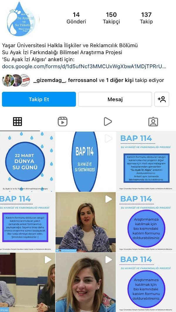 Yaşar Üniversitesi Halkla İlişkiler ve Reklamcılık Bölümü'nden Doç. Dr. Ferah Onat ve Dr. Öğretim Üyesi Dilek Melike Uluçay, Bilimsel Araştırma Projesi kapsamında yürüttüğü 'Su Ayak İzi ve Su Tüketimi' projesi ile sosyal medya fenomenlerinin de iletişim desteğiyle bilinçli su tüketimi farkındalığı oluşturmayı hedeflediklerini söyledi. Doç. Dr. Onat ve Dr. Öğretim Üyesi Uluçay, Çevreyle ilgili konulara toplumun daha fazla dikkatini çekmekte yeni iletişim tekniklerinden olan 'Influencer Marketing' (Hatırlı Pazarlama) uygulamalarıyla daha fazla kişiye ulaşmak amaçlanıyor. Instagramda 30 bin takipçisi bulunan '@mutluluktasarimcisi' hesabında ve proje için açılan '@bap114_suayakizi' hesabında paylaşımlar yapan Gizem Dağ da su ayak izi farkındalığı için çağrıda bulunuyor. Dağ, gönüllü olarak, birkaç ay boyunca su ayak izi ve bilinçli su tüketimi ile ilgili hazırlanan içerikleri takipçileriyle paylaşacak ve farkındalık sağlanmasına katkıda bulunacak. Bu sürenin sonunda, hesabı takip eden takipçilerin su ayak izi farkındalığını ölçmek için bir anket uygulanacak ve sonuçları yayınlanarak kamuoyuyla paylaşılacak.