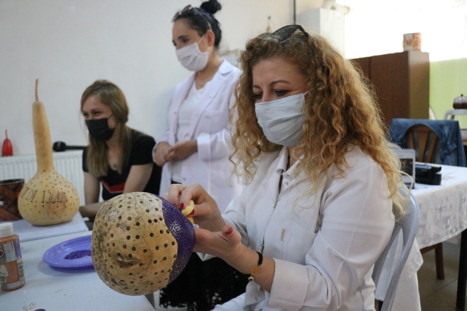 Halk Eğitim Merkezi'nde usta öğretici olarak çalışan ve uzun yıllardır su kabağı işleme kursu veren Naile Can, "Kayıtlı 15 kursiyerimiz var. Ama pandemi döneminde alanımız 8 kişilik olduğu için bölüşümlü kursiyer alıyoruz. Yeni kayıtlarla kursiyer sayımız değişiyor" dedi.