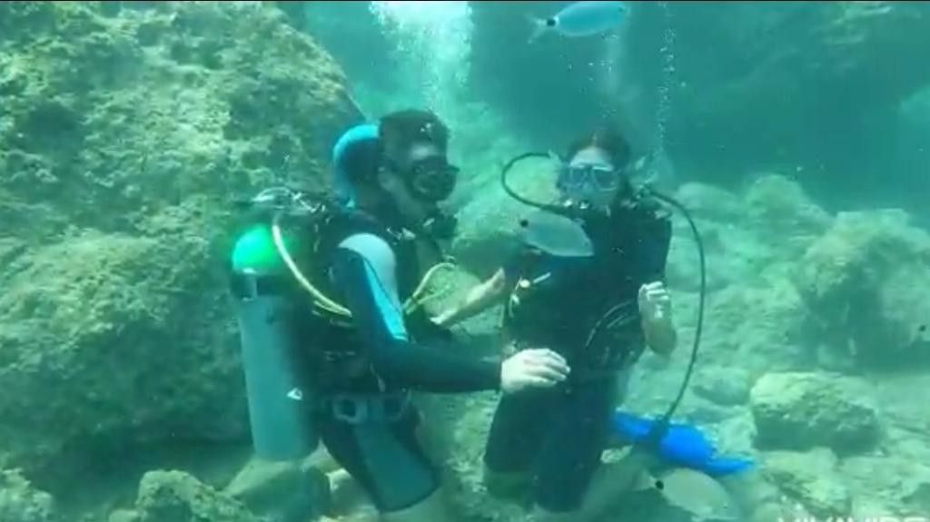 Su altında yaşanan ilginç evlilik teklifi, genç çiftin arkadaşları tarafından su altı kamerası ile kaydedilerek unutulmaz anlar ölümsüzleştirildi.
