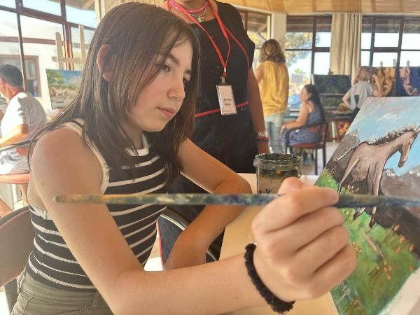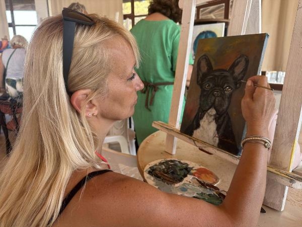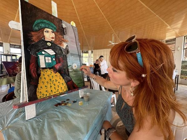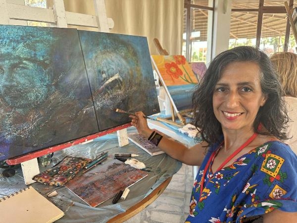 Ukrayna - Rusya arasındaki savaştan etkilendiğini belirten Ukraynalı ressam Julia Mia da çalıştayda ülkesinde yaşanan baraj patlaması sonucu yaşanan olayları yaptığı resimde dile getirip, savaşın bir an önce bitmesini ve barış ve huzurun gelmesini istedi.