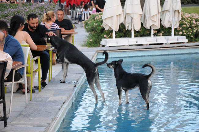 İzmir'de sıcaklardan bunalan sevimli dostlar süs havuzlarında serinlemeye başladı. Süs havuzlarında oynayan, suya yatan hayvanlar yüzlerde gülümsemeye neden oldu.