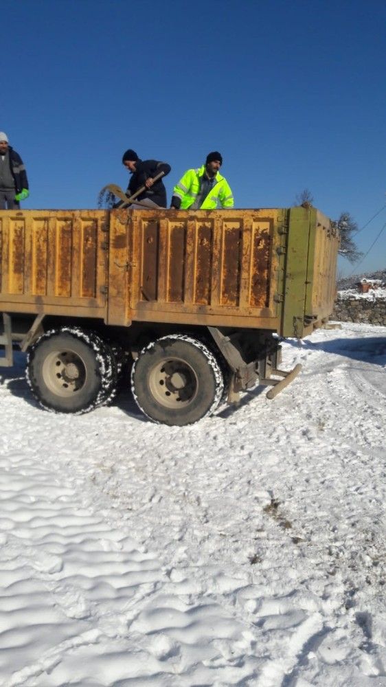 Bergama'da kar yağışı ve soğuk nedeniyle buz tutan kırsal mahalle yolları, süt toplama araçlarına geçit vermediğinden, Bergama Belediyesi tarafından tuzlanarak ulaşıma açık tutuluyor.