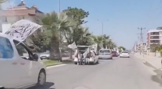Dün öğle saatlerinde Aydın'ın en merkezi noktalarından birinde onlarca araç, Taliban tarafından kullanılan Tevhid bayrağını kullanarak konvoy yaptı.