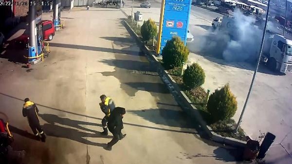 Öte yandan olay, akaryakıt istasyonunun güvenlik kamerasına yansıdı. Görüntülerde; lastiklerinden alev çıkan tankerin akaryakıt istasyonunda durması, sürücünün müdahalesi ve patlama anı yer aldı.