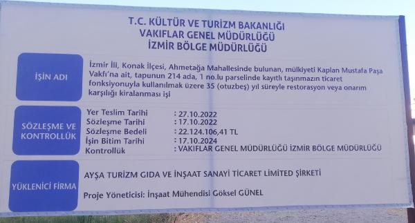 İZMİR'in Konak ilçesinde kısmi yapılaşmaya açılacağı belirtilen 120 yıllık Kaptan Mustafa Paşa İş Merkezi alanına, projenin detaylarına ilişkin pano yerleştirildi. Proje bedelinin 22 milyon 124 bin 106 TL olduğu ve ticaret merkezi olarak kullanılmak üzere, 35 yıl süreyle restorasyon veya onarım karşılığı kiralandığı belirtildi.