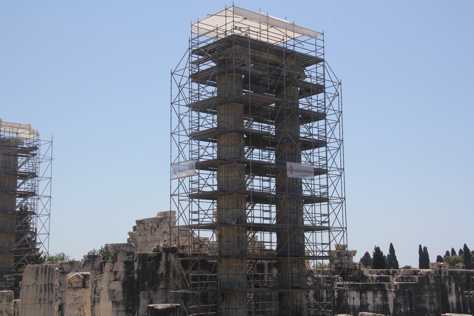 Geçmişinde birçok medeniyete ev sahipliği yapan ve ören yerleri ile adeta açık hava müzesi olan Aydın'da 2 bin 300 yıl sonrasında bir ilk yaşanacak. Aydın İl Kültür Turizm Müdürlüğü koordinesinde Didim ilçesinde bulunan tarihi Apollon Tapınağı'nda restorasyon çalışmaları başlaması ile birlikte tarihi tapınakta bulunan sütunlara da yüzyıllar sonra ilk kez çıkılacak. Restore öncesinde yapılan çalışmalarda uçan göz ile çekilen fotoğraflarda tarihi sütunların üst kısımlarında çatlakların meydana geldiği tespit edildi. Çatlakların ve çeşitli yerlerinde meydana gelen kopmaların önüne geçilmesi adına restore çalışmaları burada başlatılırken, kurulan platformlar yardımıyla sütunların tepesine çıkan kazı ekipleri, 2 bin 300 yıl aradan sonra bir ilki gerçekleştirdi.