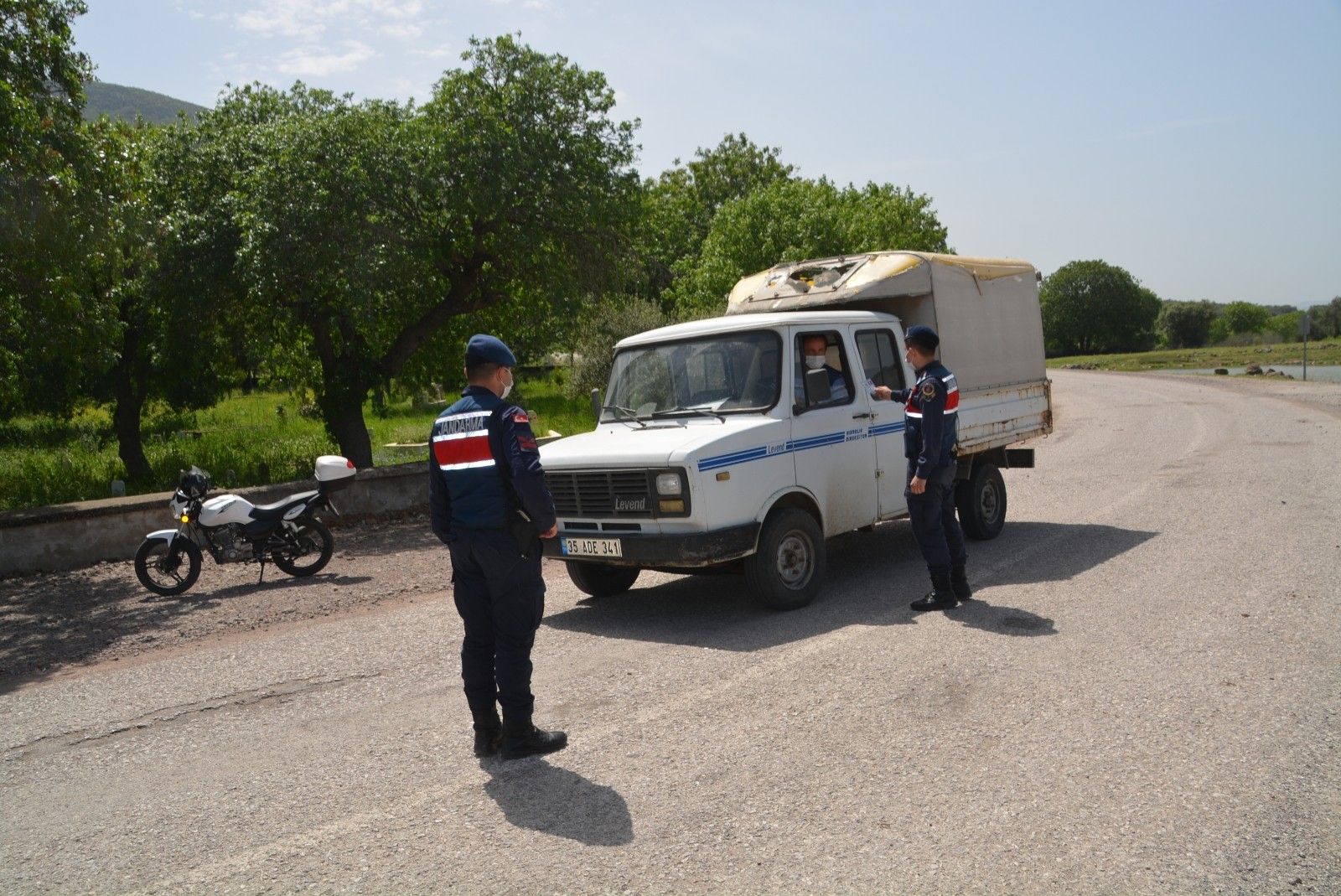 Öte yandan, denetimlerini sıklaştıran Aliağa İlçe Jandarma Komutanlığına bağlı ekipler, sorumluluk bölgelerinde oluşturdukları kontrol noktalarında araçları tek tek durdurarak gerekli izin belgeleri olup olmadığı kontrol ediyor. Jandarma ekipleri, Karakuzu Mahallesi'nde bulunan kontrol noktasından, Manisa ilinden Aliağa ilçesine geçiş yapmak isteyen sürücülere ve araçta bulunan yolculara kimlik kontrolü yapıyor, nereden geldiklerini ve izin belgelerini sorguluyor.