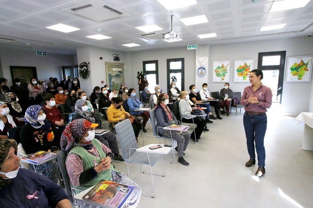 Efes Tarlası Yaşam Köyünde kadın üreticilere yönelik düzenlenen eğitime katılan Ziraat Mühendisleri Odası İzmir Şubesi adına etkinliğe katılan Mine Pakkaner, Doğa Dostu Tarım Uygulamaları konulunu sunumunu yaptı. Endüstriyel tarıma karşı doğa dostu, kadim tarım yöntemlerinin kullanılması gerektiğinin altını çizen Pakkaner, "Ülkemizin ve dünyanın tarımsal geleceği adına küçük aile çiftçiliğini çok önemli buluyorum. Küçük üretici olmazsa tarım asla sürdürülebilir olmaz. Siz küçük üreticiler gıdanın ve geleceğinin teminatısınız. Tarımda emeği olan, elini taşın altına koyan herkesin günü kutlu olsun. Pandemi tarımın, gıda egemenliğinin ne kadar önemli olduğunu bize daha fazla anlattı. Tüm üretenlerin emeğine sağlık" dedi.