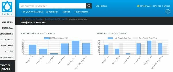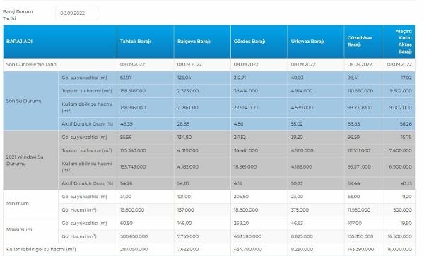 İzmir Büyükşehir Belediyesi Su ve Kanalizasyon İdaresi (İZSU) Genel Müdürlüğü verilerine göre, özellikle İzmir'in ana içme suyu kaynağı olan kentin yüzde 44'lük su ihtiyacının karşılandığı Tahtalı Barajı'nda geçen yıl yüzde 54,26 olan su seviyesi, bu yıl yüzde 48,39'a düştü. Balçova Barajı'nın geçen yıl yüzde 54,87 olan su seviyesi ise 28,68'e düştü. Bu nedenle barajdan su alımı geçen hafta perşembe gününden itibaren durduruldu. Buna karşın küçük kapasiteli barajlardan Ürkmez'de su oranı 50,73'ten 55,02'ye, Alaçatı Kutlu Aktaş Barajı'nda 43,13'ten 56,26'ya, Gördes'te ise 4,15'ten 4,56'ya çıktı.