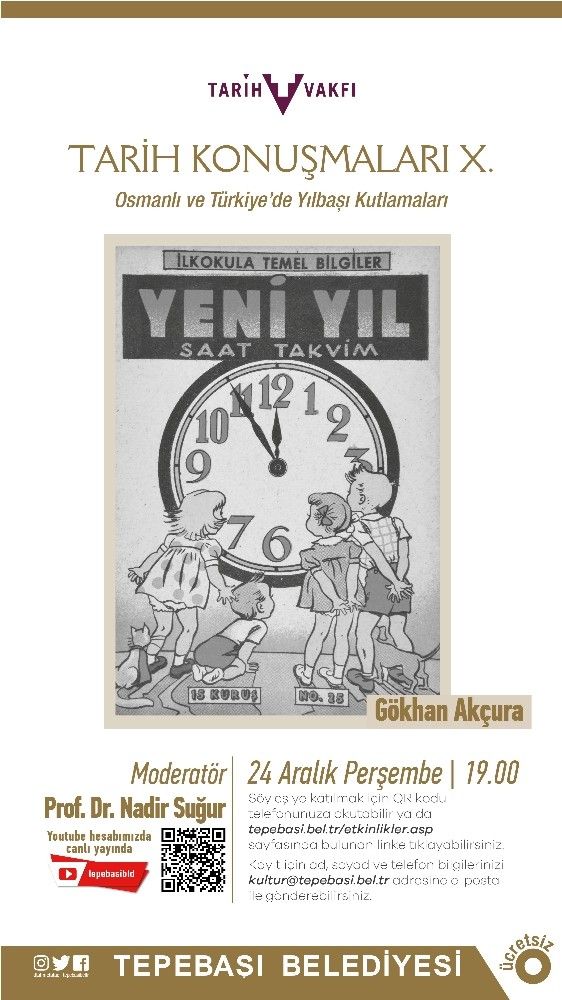Tarihe ilgi duyan vatandaşların yoğun ilgisi ile gerçekleştirilen etkinliğin onuncusu koronavirüs salgını nedeniyle online olarak gerçekleşecek. "Osmanlı ve Türkiye'de Yılbaşı Kutlamaları" başlıklı Tarih Konuşmaları'nın moderatörü Prof. Dr. Nadir Suğur, konuğu ise Gökhan Akçura olacak. Söyleşiye katılmak isteyen tarih severler, etkinliğin QR kodunu ya da "tepebasi.bel.tr/etkinlikler.asp" sayfasında bulunan linki kullanabilecek.