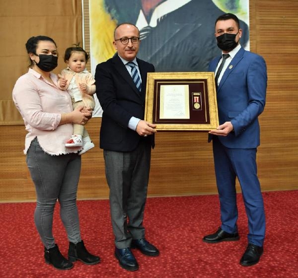 Konuşmanın ardından, 2015'de Hakkari'nin Şemdinli ilçesinde gazi olan Burak Özlü'ye, 2016'da Van'ın Çaldıran ilçesinde gazi olan Gökhan Yılmaz'a, 2016'da Suriye El-Bab bölgesinde gazi olan Hüseyin Serinkan'a, 2017'de Suriye El-Bab bölgesinden gazi olan Samet Gülüstan'a Cumhurbaşkanı Recep Tayyip Erdoğan tarafından tevcih edilen Türkiye Cumhuriyeti Devlet Övünç Madalyaları Vali Ali Fuat Atik tarafından verildi. Vali Atik ve diğer protokol üyeleri törenin ardından gazi aileleri ve yakınları ile bir süre sohbet ettikten sonra hatıra fotoğrafı çektirdi. (DHA)