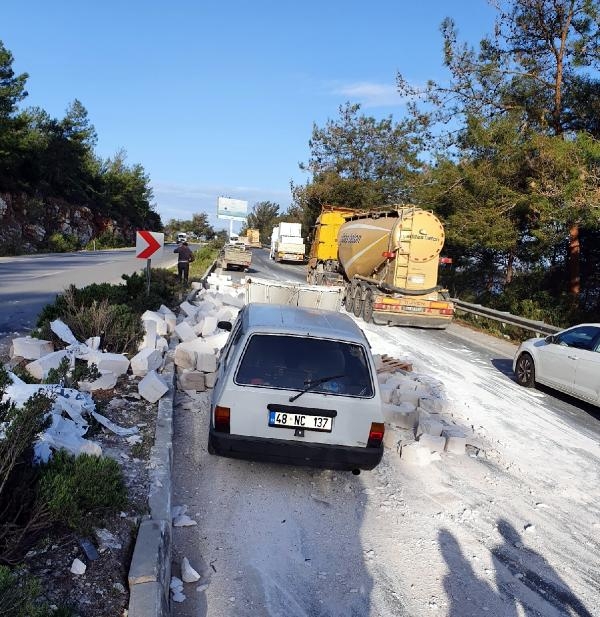 Kaza, bugün sabah saatlerinde Milas- Bodrum karayolu Güvercinlik Mahallesi istikametinde meydana geldi. Hamit Kocaman'ın kullandığı 56 AAB 165 plakalı beton blok yüklü TIR'ın virajda dorsesinin kapakları açıldı. Bağlı oldukları halat kopan beton bloklar yola savruldu. O sıra da aynı yöne seyir halinde olan Galip Yönter yönetimindeki 48 NC 137 plakalı otomobil duramayıp, yola dökülen beton bloklara çarptı. Kazada şans eseri yaralanan olmazken, otomobilde maddi hasar meydana geldi. Yola dökülen beton bloklar nedeniyle trafik bir süre tek şeritten verildi. Beton blokların kaldırılmasının ardından yolda trafik akışı 1 saat sonra normal seyrine döndü.