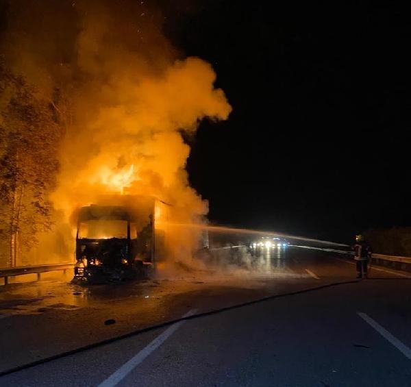 İZMİR-Aydın yolunda, kargo yüklü TIR'da seyir halindeyken çıkan yangın, itfaiyecilerin müdahalesiyle söndürüldü. TIR ve kargolar, kullanılamaz hale geldi.