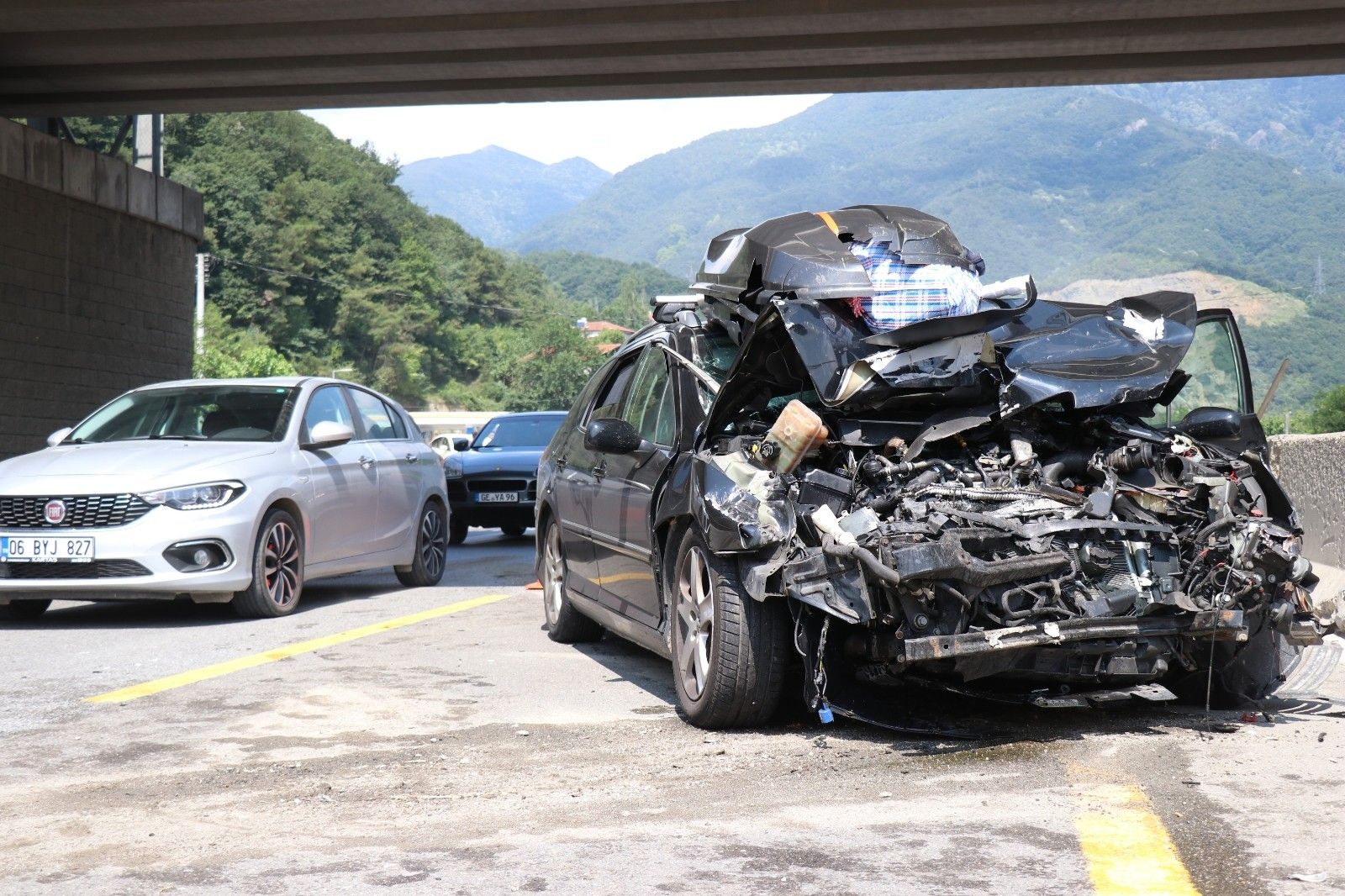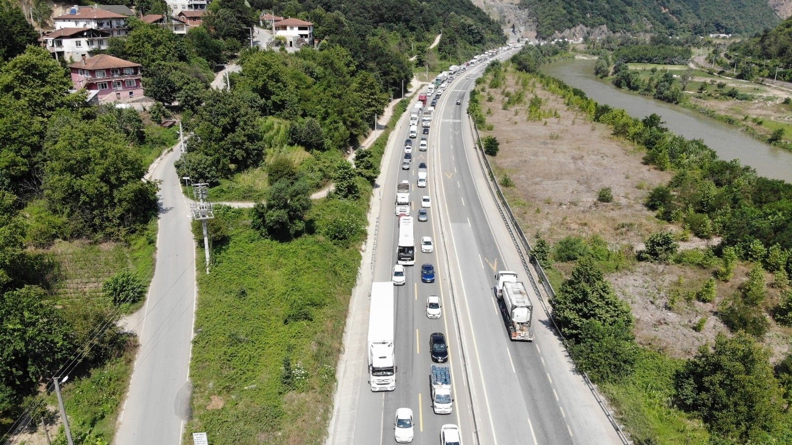 Türkiye'nin önemli geçiş güzergahlarından olan Sakarya-Bilecik D-650 karayolunda seyir halinde olan yabancı plakalı otomobil, aynı istikamette giden tıra arkadan çarptı. Meydana gelen kazada otomobilde bulunan 3 kişi yaralandı. Kaza sonrası bölgede oluşan araç kuyruğu havadan da görüntülendi.