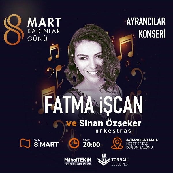 İZMİR'in Torbalı ilçesinde, 8 Mart Dünya Kadınlar Günü'ne özel konser düzenlenecek. Konserde, bir televizyon kanalındaki ses yarışmasıyla adını duyuran Fatma İşcan sahne alacak.