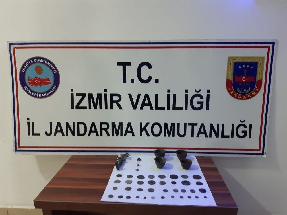 İzmir İl Jandarma Komutanlığı ekiplerince, Torbalı ilçesi Karakızlar Mahallesinde C.G. isimli şahsa ait zeytinlikte kaçak kazı yapıldığına yönelik ihbar alındı. İzmir İl Jandarma Komutanlığı ve İzmir İl Emniyet Müdürlüğü ekipleri ile birlikte yapılan operasyonla tarla sahibi C.G., ile olaya karışan M.P., Ö.T., T.A., L.B., Y.S., O.Ö., E.A., İ.C., F.D., E.D., V.Ö., E.Ö., N.A., E.A. ve yabancı uyruklu M.M. isimli şahıslar kazı bölgesi ve çevresinde yakalandı. Şüpheli Ö.T.'ye ait araçta yapılan aramada 4 adet üzerinde motifler bulunan kase, 1 adet bronz yüzük, 1 adet mühür, 1 adet bronz kolye ucu, 1 adet üst kısmı haç şeklinde, alt kısmı ayak ve bacak tasvirli bronz obje ve 37 adet bronz-gümüş sikke olmak üzere toplam 45 adet tarihi eser ele geçirildi. Şüpheli şahıslar adli kontrol şartıyla serbest bırakıldı.