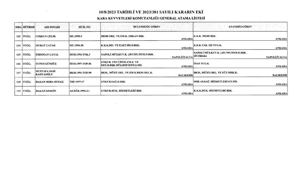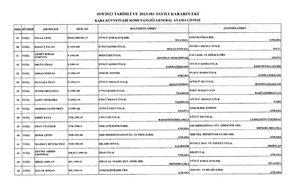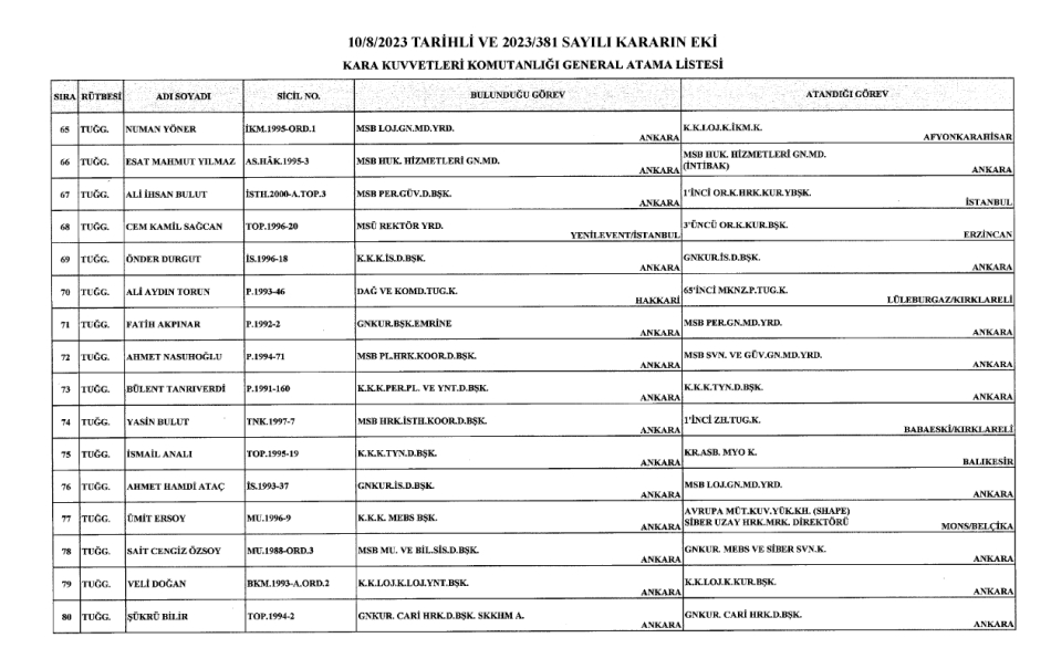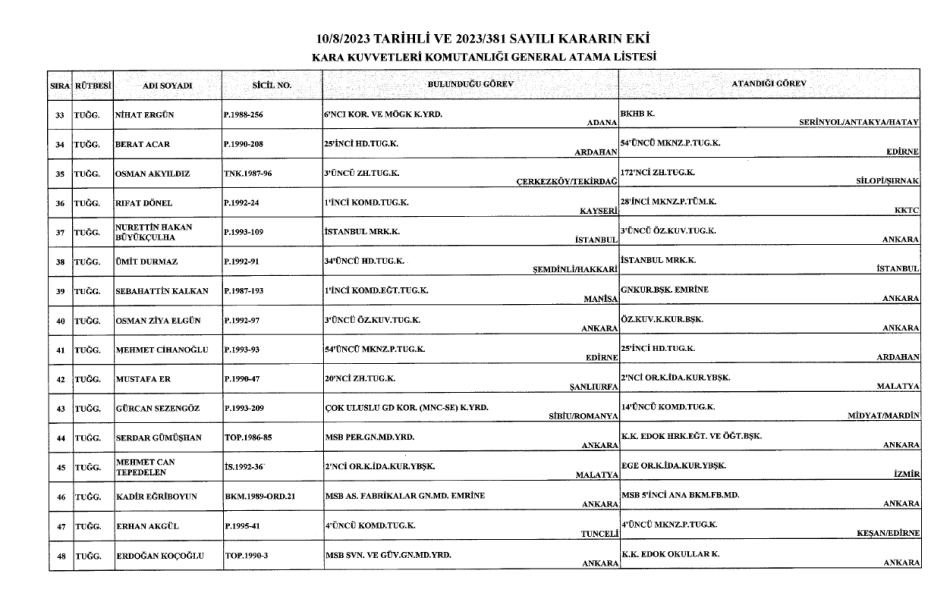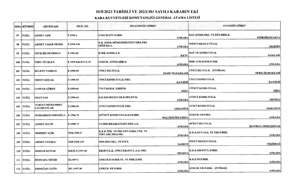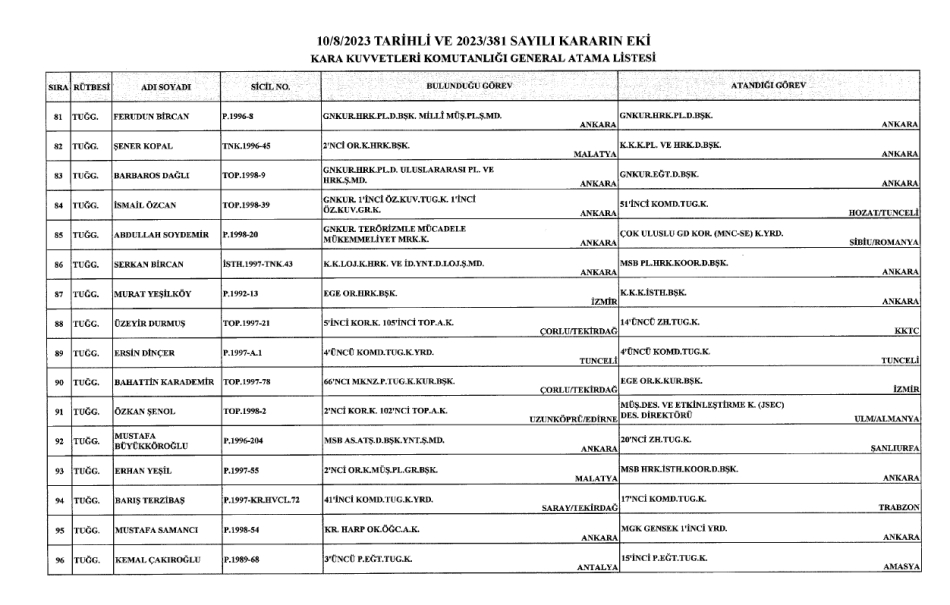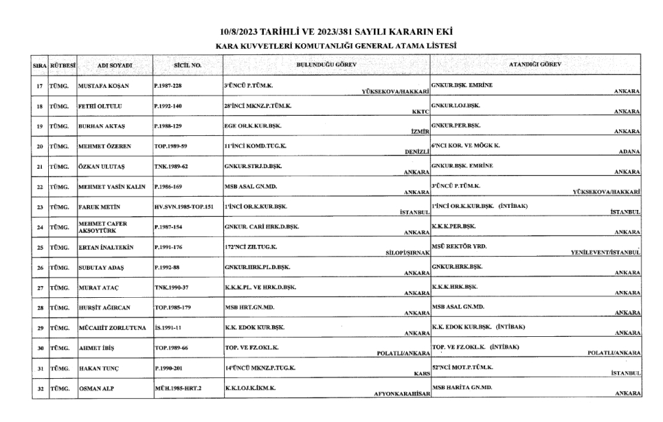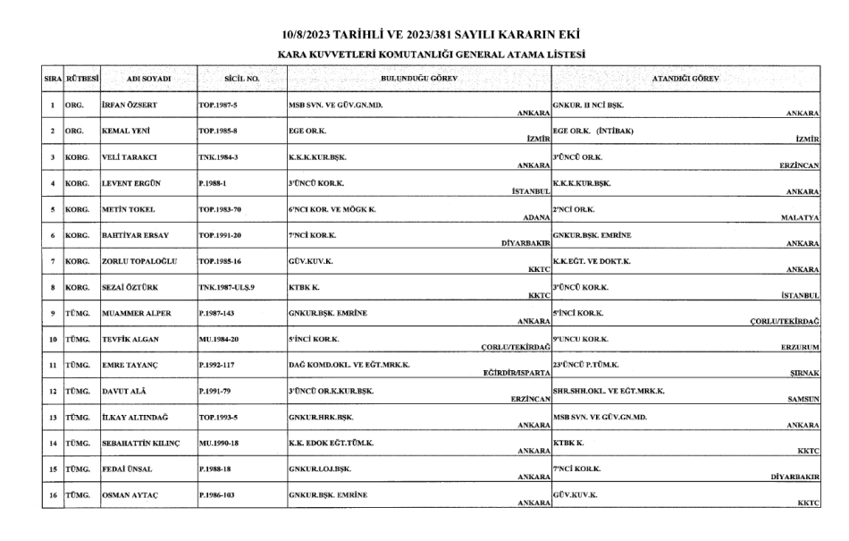 Kara Kuvvetleri Komutanlığı General Atama Listesi'ne göre Genelkurmay 2'nci Başkanlığı'na Orgeneral İrfan Özsert, Ege Ordusu Komutanlığı'na (İntibak) Orgeneral Kemal Yeni, 3'üncü Ordu Komutanlığı'na Korgeneral Veli Tarakcı, Kara Kuvvetleri Komutanlığı Kurmay Başkanlığı'na Korgeneral Levent Ergün, 2'inci Ordu Komutanlığı'na Korgeneral Metin Tokel, Kara Kuvvetleri Eğitim ve Doktrin Komutanlığı'na Korgeneral Zorlu Topaloğlu, 3'üncü Kolordu Komutanlığı'na Korgeneral Sezai Öztürk, 5'inci Kolordu Komutanlığı'na Tümgeneral Muammer Alper, 9'uncu Kolordu Komutanlığı'na Tümgeneral Tevfik Algan atandı.