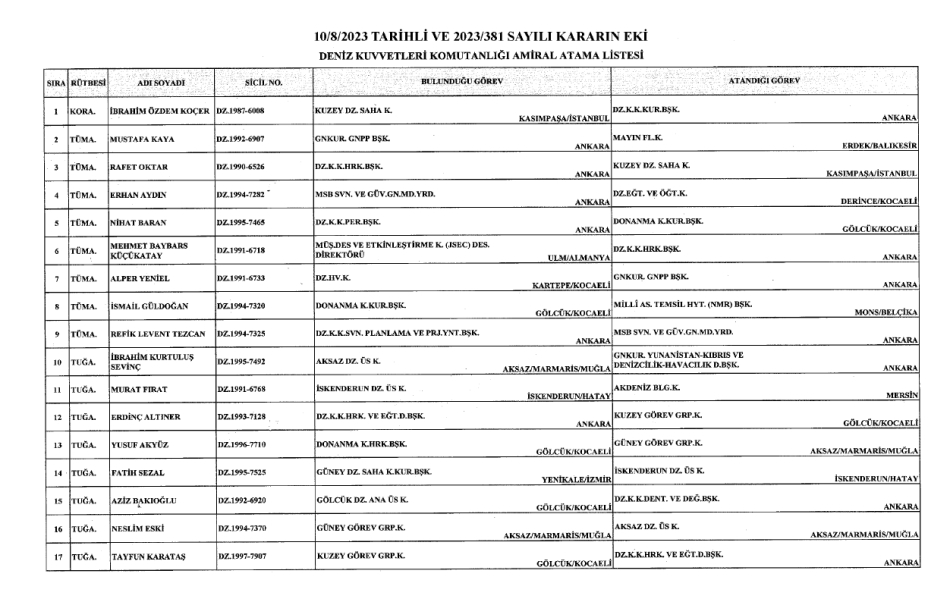 Deniz Kuvvetleri Komutanlığı Amiral Atama Listesi'ne göre Deniz Kuvvetleri Komutanlığı Kurmay Başkanlığı'na Koramiral İbrahim Özdem Koçer, Mayın Filosu Komutanlığı'na Tümamiral Mustafa Kaya atandı.