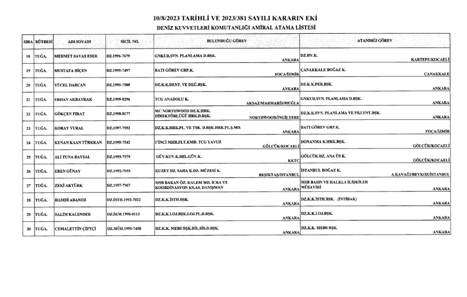 Kararla Kara Kuvvetleri Komutanlığı'ndan 119 general, Deniz Kuvvetleri Komutanlığı'ndan 30 amiral, Hava Kuvvetleri Komutanlığı'ndan 38 generalin ataması gerçekleştirildi.