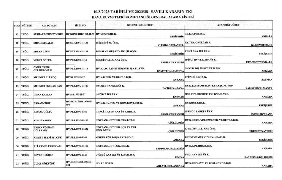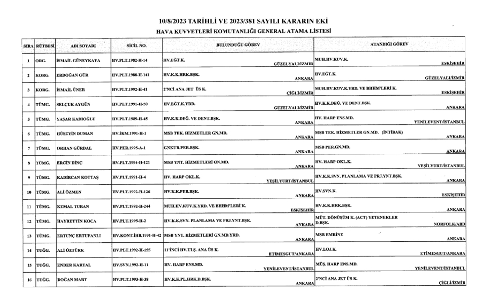 Hava Kuvvetleri Komutanlığı General Atama Listesi'ne göre de Muharip Hava Kuvveti Komutanlığı'na Orgeneral İsmail Güneykaya, Hava Eğitim Komutanlığı'na Korgeneral Erdoğan Gür, Hava Harp Okulu Komutanlığı'na Tümgeneral Ergin Dinç, Hava Savunma Komutanlığı'na Tümgeneral Ali Özmen, Hava Kuvvetleri Komutanlığı Harekat Başkanlığı'na Tümgeneral Kemal Turan atandı.