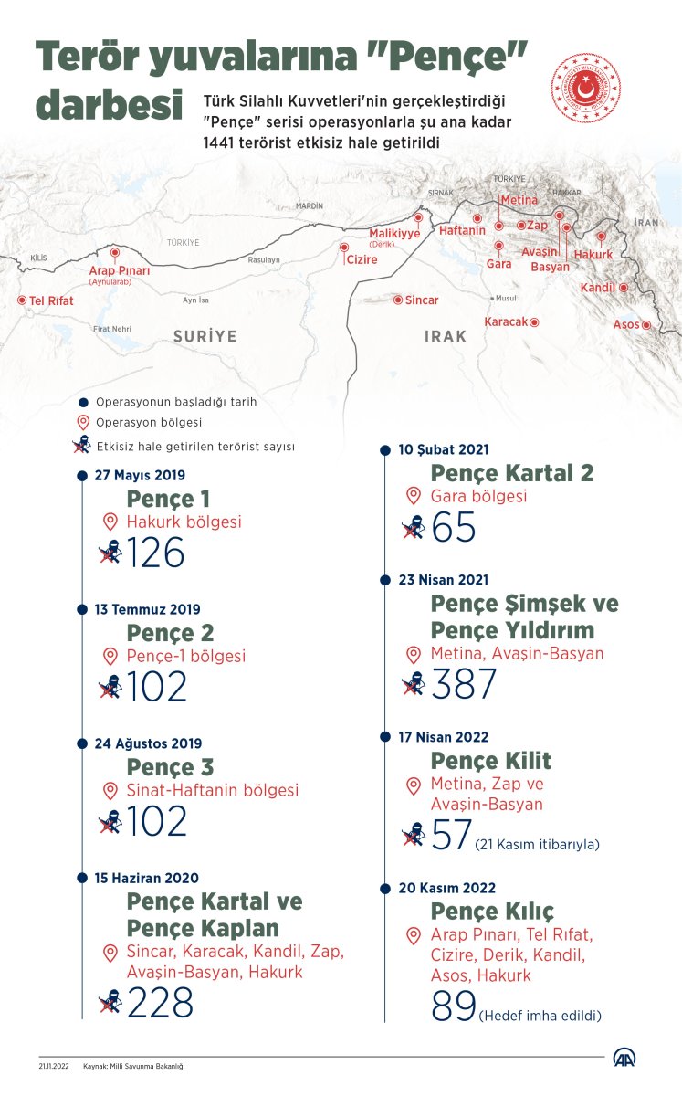 2019'da Hakurk ile başlayan Sinat-Haftanin ile devam eden, Metina ve Avaşin-Basyan ile genişleyen, Zap bölgesiyle süren "Pençe" serisi operasyonlarda şu ana kadar 1441 terörist etkisiz hale getirildi. Son olarak Hava Kuvvetleri Komutanlığı unsurlarınca Irak'ın ve Suriye'nin kuzeyindeki terör hedeflerine yönelik de Pençe-Kılıç Harekatı icra edildi.